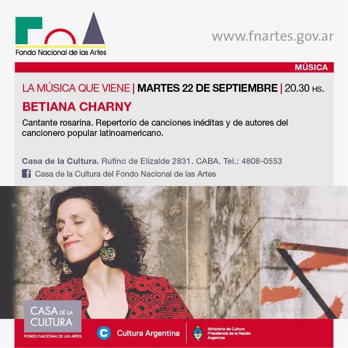 Hoy martes 22 a las 20.30 en Casa de Cultura del Fondo Nacional de las Artes (Rufino de Elizalde 2831) se presenta la cantante rosarina Betiana Charny con canciones propias y del repertorio Latinoamericano.