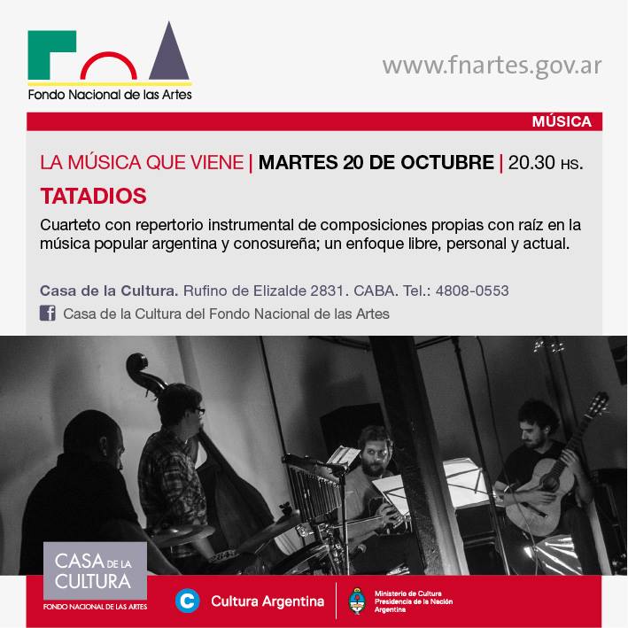 Hoy martes 20 a las 20.30 en el Fondo Nacional de las Artes (Casa de cultura) Rufino de Elizalde 2831, se presenta TATADIOS, un cuarteto de repertorio instrumental con mirada propia de la música popular argentina y conosureña hará sus canciones de tinte actual.