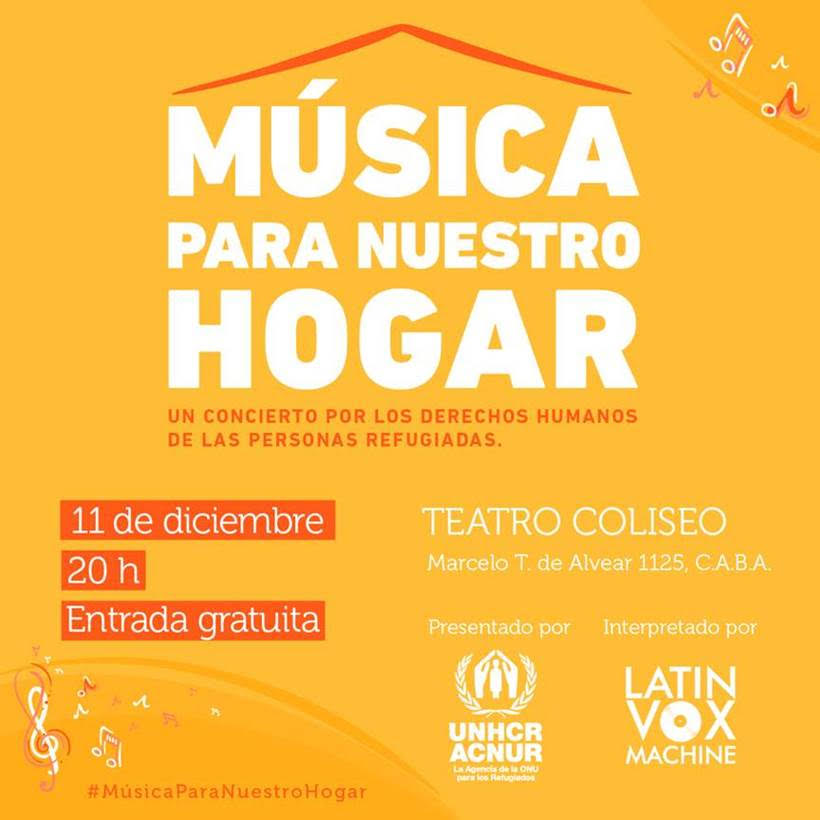 Mañana a las 20 tendrá lugar en el Teatro Coliseo un concierto por los derechos de las personas refugiadas organizado por Acnur, la agencia de la ONU que se encarga de la temática. Se presentará en vivo la Orquesta «Latin Vox Machine» conformada por 100 músicos latinoamericanos de Chile, Paraguay, Colombia y Argentina. El espectáculo «Música para nuestro hogar, un concierto por los derechos humanos de las personas refugiadas» se propone a través de la interpretación de temas como Tanguera, Regresa Pronto y La Cumparsira, entre otros, cantar a favor de la resiliencia -adaptación frente a la adversidad- de los refugiados y también la bienvenida cálida de los que viven en nuestro país hacia ellos. El evento será conducido por Osvaldo Laport (embajador de buena voluntad de Acnur en Argentina) y contará con dos presencias especiales refugiados sirios, Maher Bajjour y Georgette Albshara, que taerán sonidos de medio oriente para completar la noche perfecta.