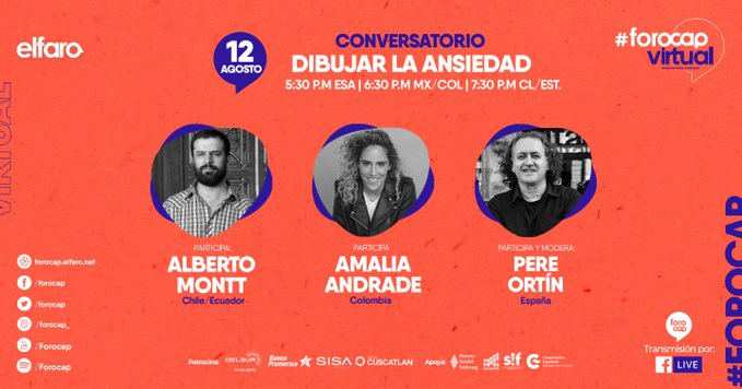 En el Facebook El Faro live el miércoles 12 de agosto del 2020 se hace a las horas de los países indicada, el encuentro Dibujar la ansiedad que organiza Foro Cap Virtual para América Latina y el Caribe y los países de Europa, en el que Pere Ortín, Amalia Andrade y Alberto Montt charlan en vivo
