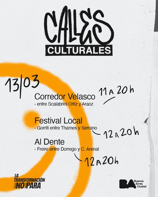 Las calles culturales elegidas son Gorriti, Velasco, y la esquina del Il Ballo del Mattone. A su vez, los asfaltos, libres por el fin de semana, de este festival, se ubican en lugares que a su vez son muy transitados los otros días, Gorriti, entre Thames y Serrano, La esquina de las pastas, Freire, entre Dorrego y C. Arenal y por último Velazco, entre Araoz y S. Ortiz. Habrá muchos shows de 11 y 12 a 20: espectáculos para niños, Trap y Rap, desfiles, artes plásticas y mucho más.