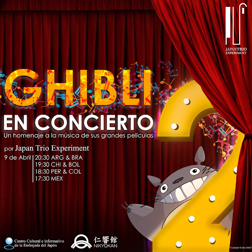 Ghibli en concierto es una experiencia vía Streaming a la que se puede acceder en este formulario que comienza esta noche a las 20:30. Esta experiencia se realiza por segunda vez debido al éxito de la primera. Está relacionada con un tributo a las películas de animación japonesas de uno de los estudio más aclamados allá: Ghibli. A pesar de la distancia, la banda argentina Japan Trío Experiment se encargará de la música de un estilo característico sobre cine, usarán Shinobue, Wadaiko, Vibráfono, Koto, percusión, Shamisen y la voz femenina, hará canto y piano. Los integrantes son Rosario Barrios, Gastón San Cristobal, y Adrián Ferrairo. El curioso evento será para los que estén conectados de Argentina, Brasil, Chile, y muchos países más del Sur. El grupo tiene el aval de la Embajada de Japón, y la casa de artes escénicas japonesa Nikiokan.