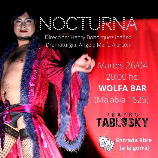 La obra pertenece al grupo de Teatro Tablosky, «donde el actor se hace», en las tablas, es teatro independiente y lo hacen con formación empírica. Esta es su primera función en Buenos Aires de Nocturna, la obra la dirige quien creó el grupo Henry Ibáñez, la cita es mañana a las 20 horas en el bar Wolfa (Malabia 1825, frente a Plaza Armenia). Entrada libre.