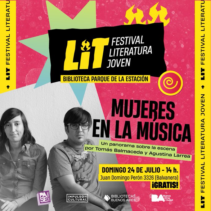 Después de la apertura en microcentro, la fiesta Lit para jóvenes continúa en la biblioteca Parque de la Estación hoy sábado 23 de julio del 2022 y mañana domingo 24 de julio del 2022. Mañana además se presentarán los semi intelectuales Agustina Larrea y Tomás Balmaceda. Según Tomás en su cuenta de Tw para él La Rueda Mágica no para hablarán de «de musas, rock e historias, mujeres en la música», también van a llevar algunos Quién es la chica para sortear! Juan Domingo Perón 3326 (Balvanera) gratis.