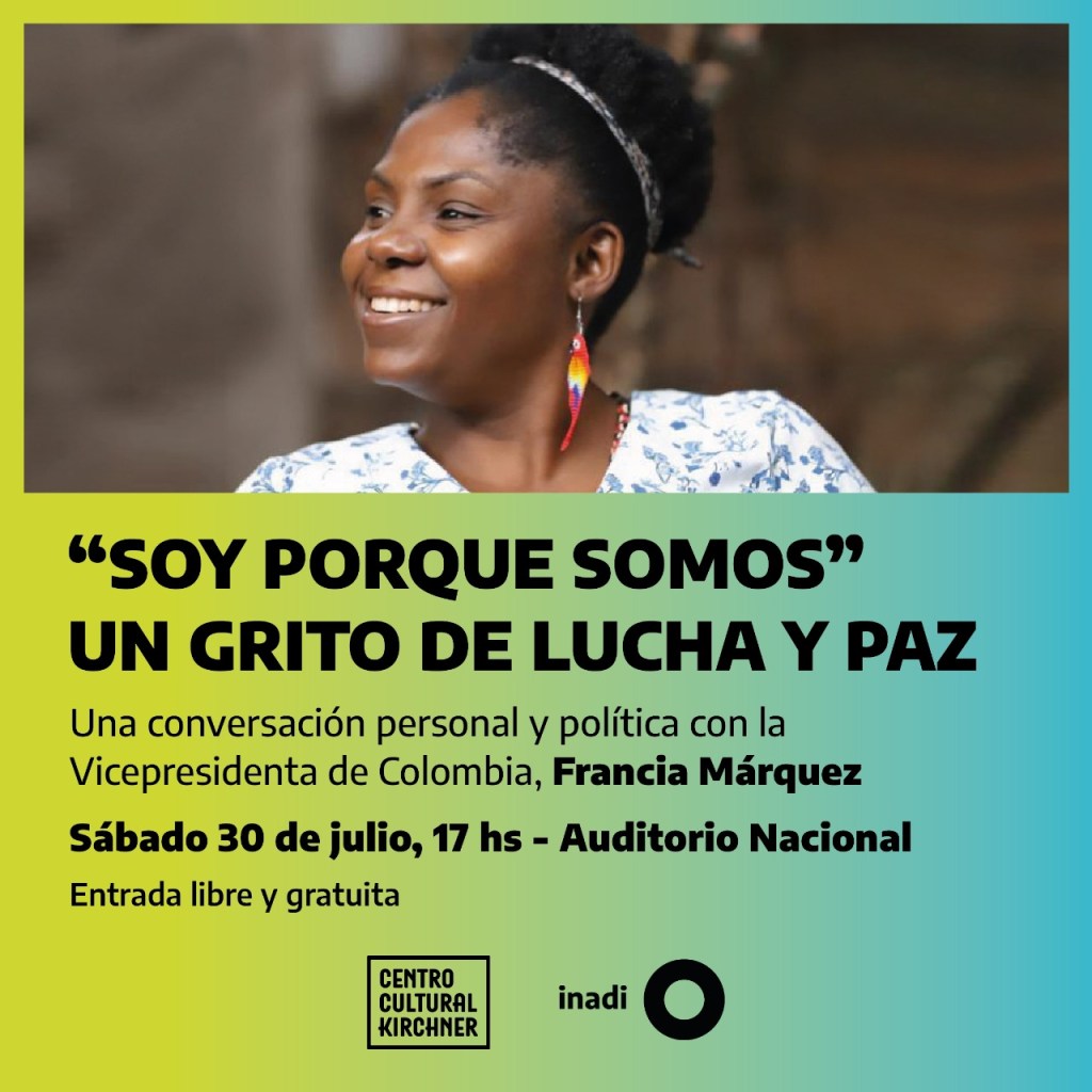 La Vicepresidenta de Colombia -recientemente electa- conversará con el público sobre su vida y la política: «Soy porque somos» un grito de lucha y paz. El encuentro será dentro del CCK en Sarmiento 151 CABA, este sábado 30 de julio del 2022 a las 17 horas en el Auditorio Nacional con entrada libre y gratuita!