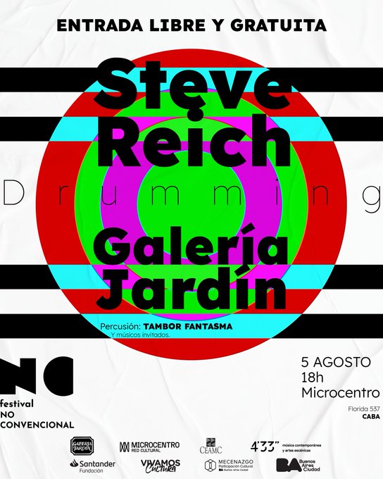 Tocará en vivo y gratis Steve Reich en drumming, percusión. El artista de sonidos hará (dentro del Festival) el espectáculo «Tambor fantasma», la interpretación de la primera obra maestra del minimalismo norteamericano. La entrada cabe destacar que no precisa reserva, además el espacio en donde se hace es una joya de Bs. As. apoya Mecenazgo.