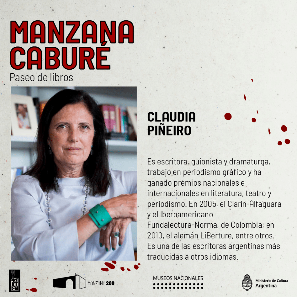 La mesa de Claudia Piñeiro que ha ganado premios nacionales e internacionales por sus libros, se realiza en La Manzana de las luces (Perú 272, Caba) hoy sábado 20 de agosto del 2022 a las 17 horas, a propósito del encuentro Manzana de las Luces . Librería Caburé, que dura hasta unas horas más y consiste en mucha música, charlas en vivo, lecturas, cortometrajes, feria de libros, y lecturas.