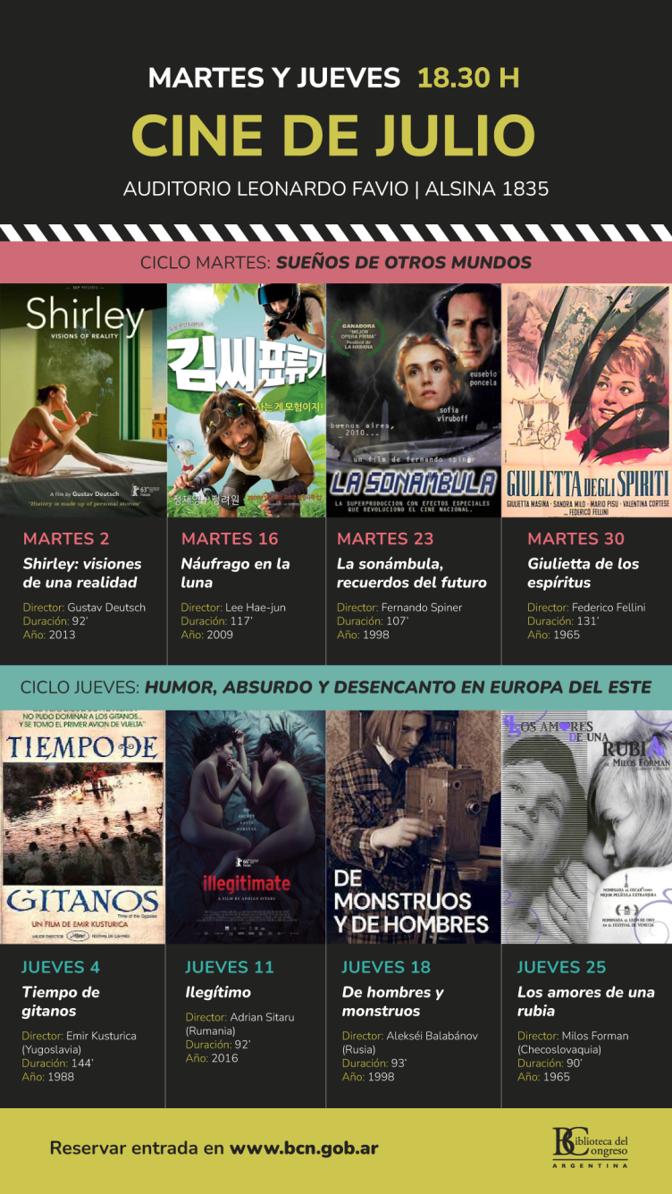 El ciclo que será en el auditorio Leonardo Favio de la Biblioteca de Congreso de la Nación comenzará las 18.30 ambos días de la semana -los martes y jueves-, en julio. La dirección es Alsina 1835, podrán concurrir allí, los martes darán «Sueños de otros mundos» y los jueves «Humor, absurdo y desencanto en Europa del Este» (fotos del banner) con reserva de entrada