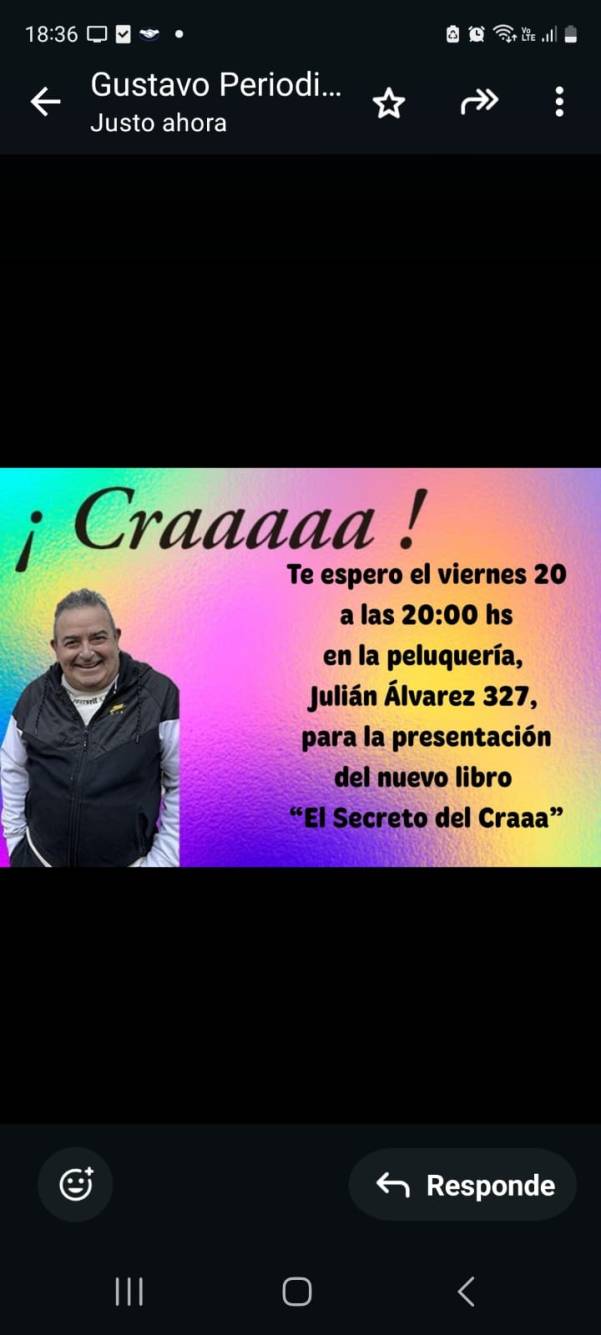 La presentación será este viernes a las 20 en la peluquería donde trabaja como peluquero profesor de tiempo completo, Julián Álvarez 327, Villa Crespo, Caba, allí se junta con amigos y discute, y vive casi, ahora le toca presentar lo nuevo, un libro de su autoría, El secreto del Craaa, ante los presentes, se esperan muchas sorpresas, y la brillante publicación.