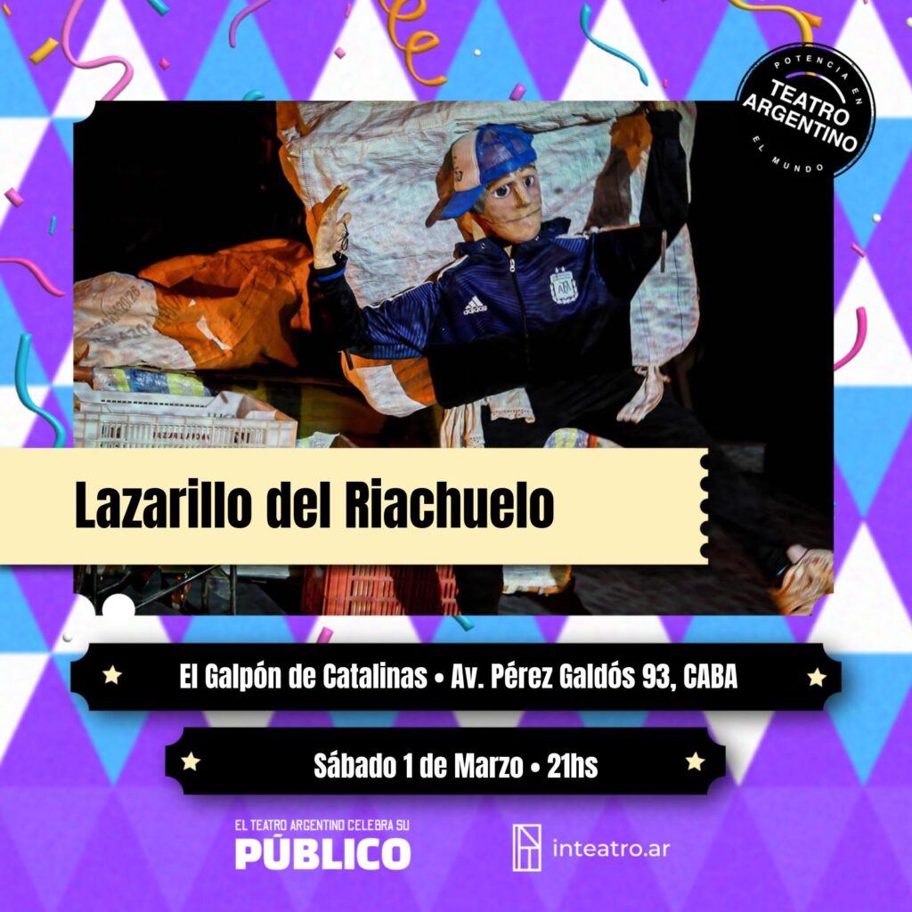 El espectáculo se llama Lazarillo del Riachuelo, está protagonizado en dramaturgia e interpretación por Gonzalo Guevara, en el Galpón del Catalinas, Av. Pérez Galdós 93, La Boca. Se trata de un show sumamente atractivo por la composición del personaje, en donde a través del arte se cuenta la historia de un cartonero que atraviesa distintos escenarios. No es el cartonero de todos los días, es el de todas las escenas.