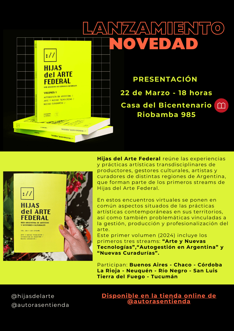 Hijas del arte y Autoras en Tienda, son dos editoriales autogestivas que organizaron este encuentro para exponer Hijas del arte federal en la Casa Nacional del Bicentenario (Riobamba 985); el evento del libro será el sábado (22 de marzo) a las 18 horas. Cabe destacar que estarán presentes muchas provincias a a través de las protagonistas que conforman la novedad, Chaco, Córdoba, Etc. Los streams que componen el libro están divididos en tres partes, todos organizados en 2024. El libro habla de Arte y nuevas tecnologías, Autogestión en Argentina, y Nuevas curadurías. La entrada es gratuita.