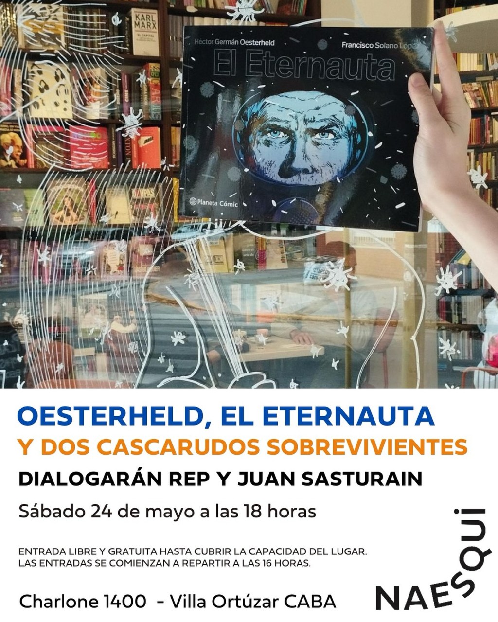 La velada es para juntarse a hablar del Eternauta, la historieta publicada por primera vez por Héctor Oesterheld y Francisco Solano López, (entre 1957 y 1959, 1969 y entre 1976 y 1977). Las viñetas hablaban de cosas como la dictadura y los desaparecidos, luego se adaptó en Netflix al formato de serie por Bruno Stagnaro, de Pizza, birra y faso, en donde se puso en relieve el héroe colectivo para representar los climas vividos en esa época, ahora en TV es muy popular, la segunda serie más vista en el mundo entero hace un mes. Este sábado 24 de mayo a las 18 -las entradas se retiran a partir de las 16 ahí- Rep y Juan Sasturain, dialogan acerca de todo el entramado de El Eternauta, en la librería Naesqui, del barrio de Villa Ortúzar, Charlone 1400, gratis.