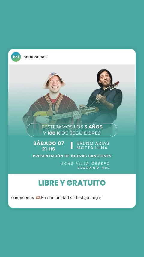 Este sábado 7 de junio festejarán los tres años de Ecas, en la sede de Villa Crespo, tocarán Motta Luna y Bruno Arias, nuevas canciones
