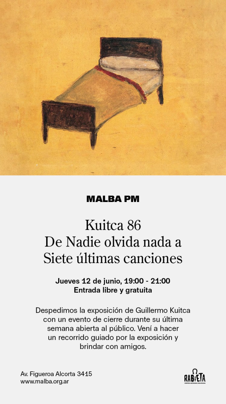 El Malba despide las obras de arte de su museo del artista Guillermo Kuitca «Kuitca 86, de nadie olvida nada a siete últimas canciones» el jueves, de 19 a 21 horas. Habrá brindis en donde se puede ir con amigos. Además se podrá recorrer toda la exposición. La cita es en Av. Figueroa Alcorta 3415, gratis. Kuitca exhibió su trabajo en los museos más importantes, como el Museo de Arte Latinoamericano de Buenos Aires, MALBA, donde será el evento de cierre. Cabe destacar que a los 64 años forma parte de las colecciones más prestigiosas incluyendo el Met y el MoMA.
