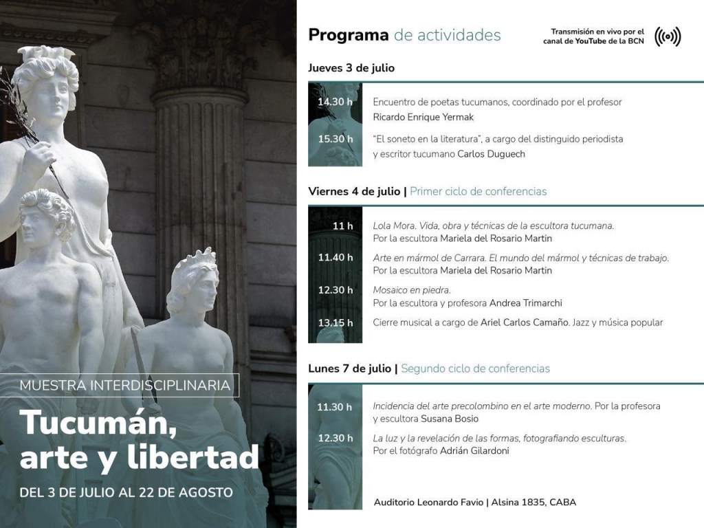 La muestra dura hasta agosto, se llama Tucumán: arte y libertad. La misma se puede visitar en la Biblioteca de Congreso de la Nación, Alsina 1835, Caba. Mañana son las conferencias, 11:30 la escultora Susana Bosio, hablará sobre la Incidencia del arte precolombino en el arte moderno y a las 12:30 un fotógrafo presentará su trabajo sobre la escultura desde la fotografía (Adrián Gilardoni). Se podrá ir a ambas actividades de manera gratuita. Es una iniciativa de la senadora Beatriz Ávila, Presidenta de la Comisión Administradora de BCN.