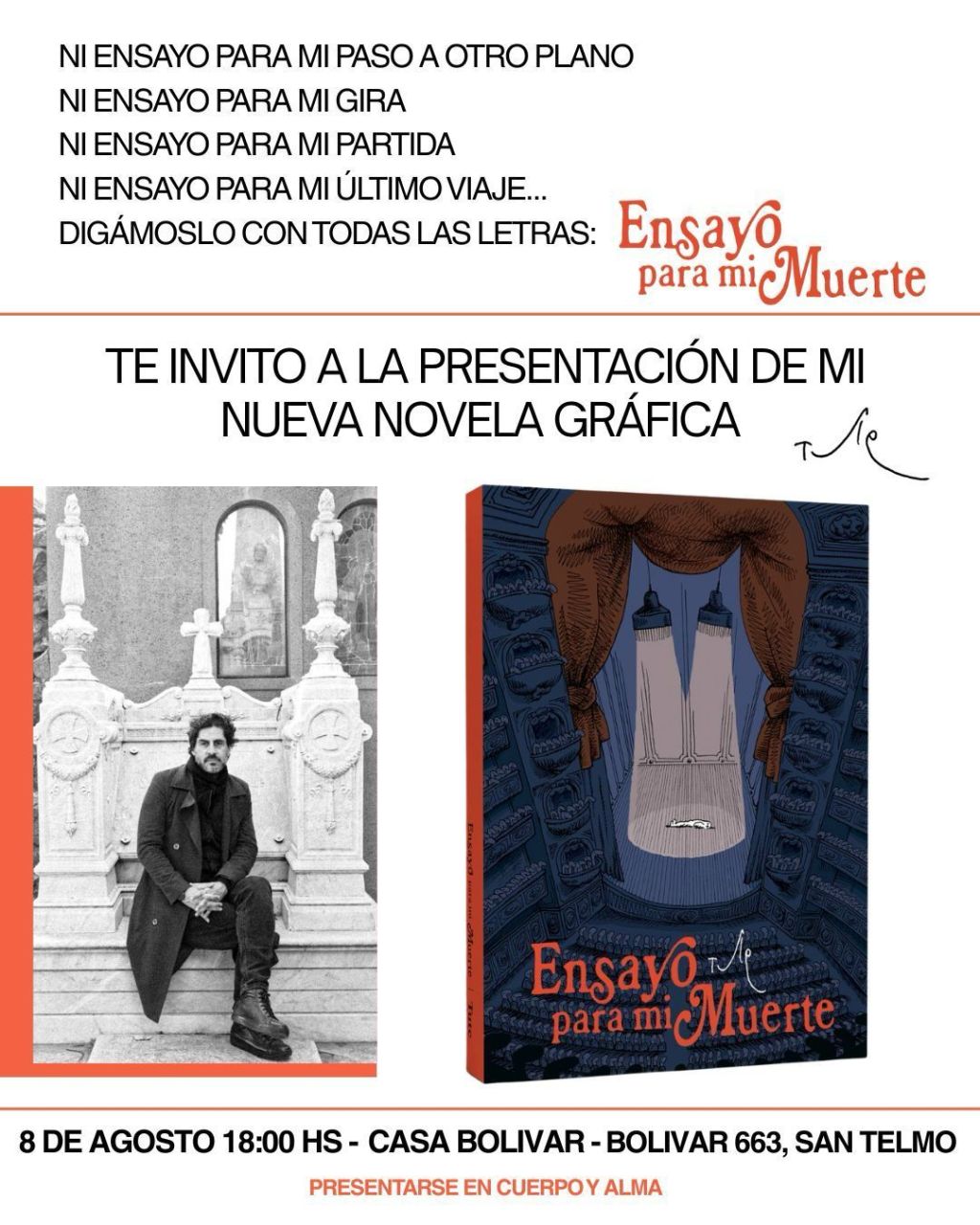 Este viernes 8 de agosto, a las 18 horas, Tute presentará «Ensayo para mi muerte» y estará consigo la música de Azabache Tango, y las lecturas de sus amigos del fútbol, Luciano Saracino y Max Aguirre, humoristas como él, a su vez la obra gráfica que se presentará habla de una cuestión esencial, la muerte del autor, su fin, y paso a otro plano, la presentación es gratuita, en una casa antigua e histórica de San Telmo que también tiene mucha significación política, Bolívar 663, Casa Bolívar, San Telmo.