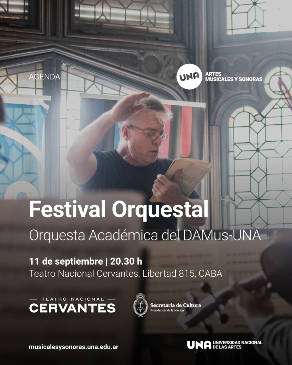 Mañana jueves, a las 20:30, en el Teatro Nacional Cervantes, que cuenta con localidades, ubicado en Libertad 815, zona céntrica, cercano a la Plaza Lavalle, apoyado por Amigos del Cervantes, se realizará un concierto libre y gratuito, denominado Festival Orquestal, con música de la orquesta del DAMus UNA, que interpretarán temas –por la noche a partir de las 20:30– de música clásica, tales como Mozart, Rossini, Bizet y muchos más, que componen su repertorio. Podrán acercarse a retirar las entradas con anticipación. A su vez, la orquesta será dirigida por el director Albinarrate, y participará como invitado en la dirección, Fernando Angulo. El concierto es para la comunidad en general, y está auspiciado por la Secretaría de Cultura de la Nación.