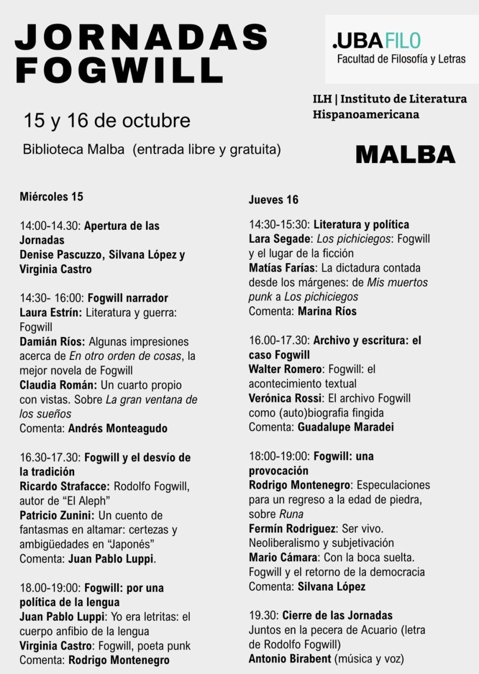 Las jornadas gratuitas se harán durante dos días, desde mañana, hasta pasado mañana jueves, en la biblioteca con entrada libre, Avenida Figueroa Alcorta 3415, Caba. Las mismas empezarán a las 14:00 horas, hasta las 19:00 y se repetirán el jueves que es cuando cierran las discusiones. Asimismo, participaran muchos intelectuales -junto a artistas- que aprecian al escritor que alcanzó la fama por «Los pichiciegos», Laura Estrín abordará Literatura y Guerra, a las 14:30 el miércoles, a su vez Ricardo Strafacce, pensará sobre El Aleph ¿Fogwill autor?, mientras Zunini interpretará certezas y ambigüedades, a las 16:30 de ese día. Cerrará la primer jornada Virginia Castro con Fogwill, poeta punk! Luego, el segundo día, Verónica Rossi pensará sobre el archivo Fogwill, autobiografías fingidas. También Mario Cámara, seducirá a los lectores sobre el aspecto del retorno a la democracia, eso será a las 18:00 horas. Darán por acabadas, junto a la voz y música de Antonio Birabent a las 19:30. Todas las actividades son free.