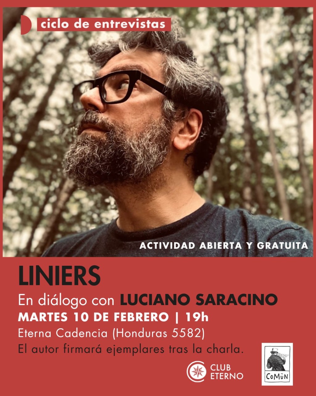 El ciclo de entrevistas, Club Eterno, que se llevará a cabo en Eterna Cadencia -una vez más, luego pasados los parecidos a flashes-, de Honduras 5582, está vez será apoyado además de la Fundación Internacional de Literatura de Buenos Aires, por la editorial Común, que publicó, entre otros, Mamarracho y El macanudo Universal 2; la charla consiste en una entrevista, que comenzará a las 19 horas, gratuita, dentro de la librería, en la que se podrá conocer más a fondo el universo de Macanudo y su autor, Liniers, quien se someterá a las preguntas del ingenioso historietista Luciano Saracino. Esta actividad abierta propone un encuentro de verano con el dibujante querido por todo el mundo, y amado por sus personajes en la tierra eterna.