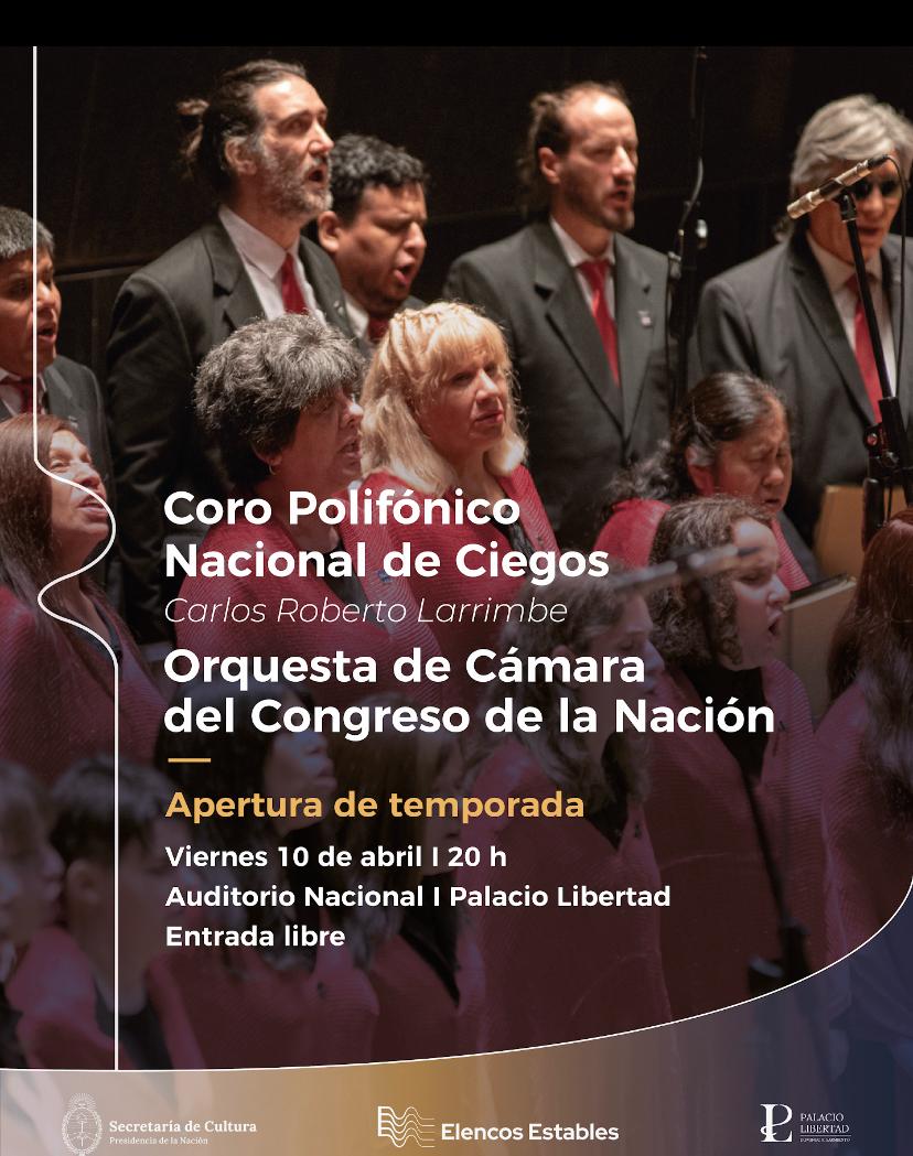 Las entradas gratuitas se retiran por mostrador del Centro Cultural en Sarmiento 151, Caba, y el encuentro musical es verdaderamente interesante, ya que juntará al Coro Polifónico Nacional de Ciegos (Carlos Roberto Larrimbe) a la Orquesta de Cámara del Congreso de la Nación, a su vez está organizado por Elencos Estables que todo el año planifica recitales orquestales de tarde y de noche, esta noche -entre otros- participarán las cantantes sopranos Clara Pinto y Laura Delogu, la contralto Laura Domínguez, el tenor Ricardo González Dorrego y el bajo Mauricio Meren.